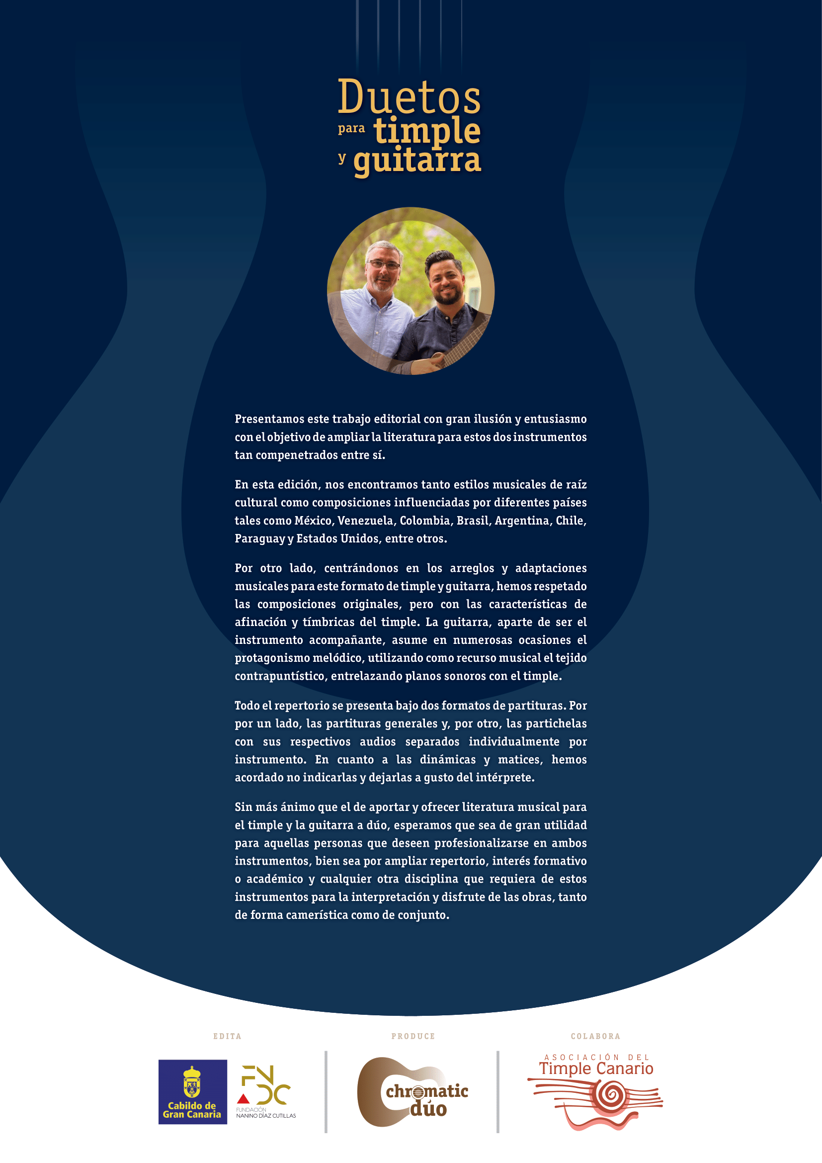 Sin más ánimo que el de aportar y ofrecer literatura musical para el timple y la guitarra a dúo, esperamos que sea de gran utilidad para aquellas personas que deseen profesionalizarse en ambos instrumentos, bien sea por ampliar repertorio, interés formativo o académico y cualquier otra disciplina que requiera de estos instrumentos para la interpretación y disfrute de las obras, tanto de forma camerística como de conjunto.